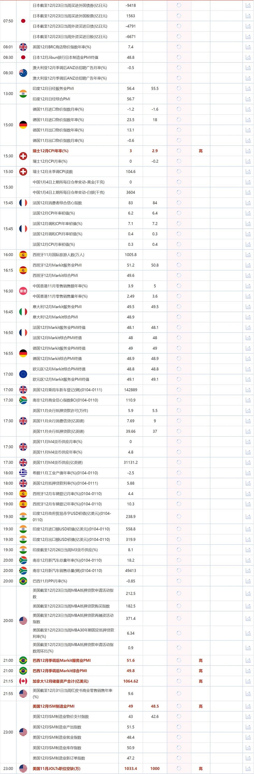 汇通财经APP讯——1月4日,投资者需要关注的重点数据:瑞士12月CPI年率,巴西12月季调后Markit服务业PMI, 巴西12月季调后Markit综合PMI,美国11月JOLTs职位空缺和美国12月ISM制造业PMI。需要关注的大事件包括欧洲央行公布11月消费者预期调查。