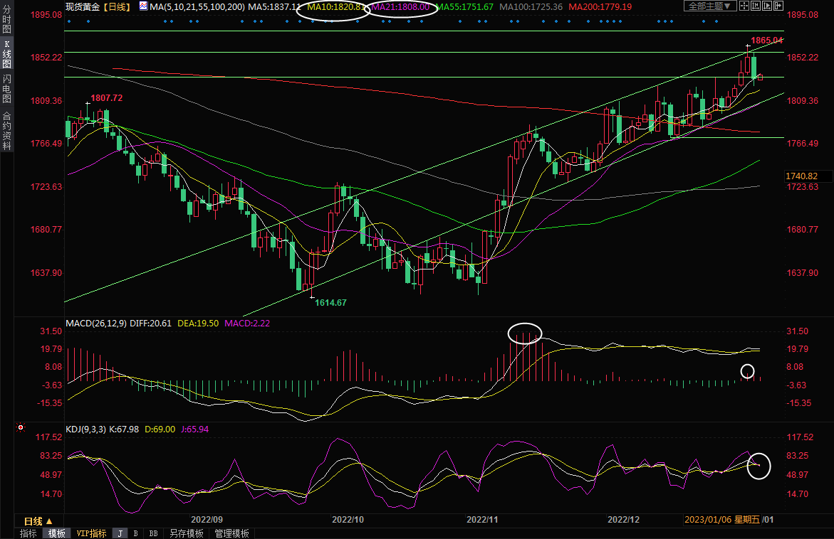 整体来看,多位美联储官员倾向于进一步加息且较长时间维持高利率水平以达成2%的通胀目标,ADP和初请失业金人数等就业数据也给美联储进一步加息提供数据支撑,美元指数短线初步见底并偏向进一步震荡上行,这对金价不利;金价在技术面也出现了一些见顶信号,除非晚间非农数据意外表现极差,否则金价短线存在进一步下行风险,下方分别关注10日均线1820.81和21日均线1808.00附近支撑。北京时间10:08,