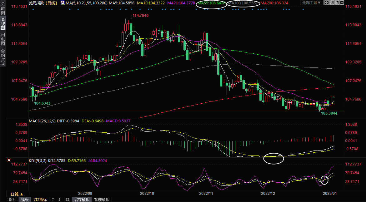 美元指数在逾半年低点103.38附近初步筑底成功,短线有望迎来一波上涨行情,初步目标看向55日均线105.64附近,激进目标甚至可以看向100日均线108.55附近。