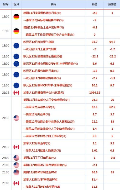 本交易日需要重点关注美国12月份非农就业报告、美国12月ISM非制造业PMI和美联储官员讲话。