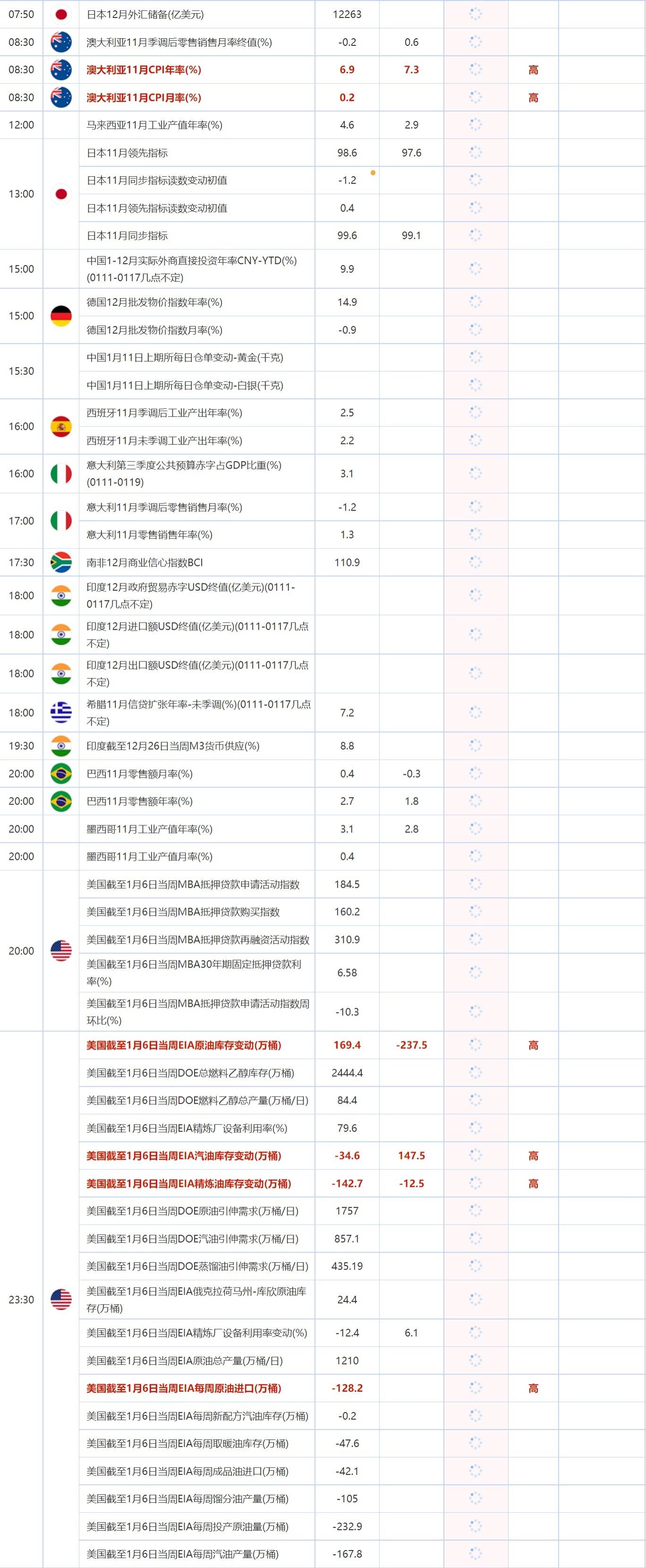 汇通财经APP讯——1月11日,投资者需要关注的重点数据:澳大利亚11月CPI年率,澳大利亚11月CPI月率,美国截至1月6日当周EIA原油库存变动,美国截至1月6日当周EIA每周原油进口,美国截至1月6日当周EIA精炼油库存变动和美国截至1月6日当周EIA汽油库存变动。需要关注的大事件包括欧洲央行管委霍尔茨曼发表讲话,欧洲央行管委维勒鲁瓦发表讲话。