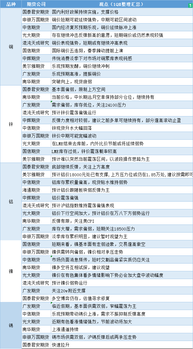 汇通财经APP讯——期货公司观点汇总一张图:1月12日有色系(铜、锌、铝、镍、锡等)
