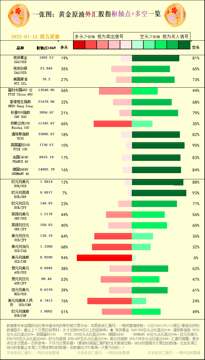 标题:一张图:黄金原油外汇股指"枢纽点+多空占比"一览(2023/01/13周五)