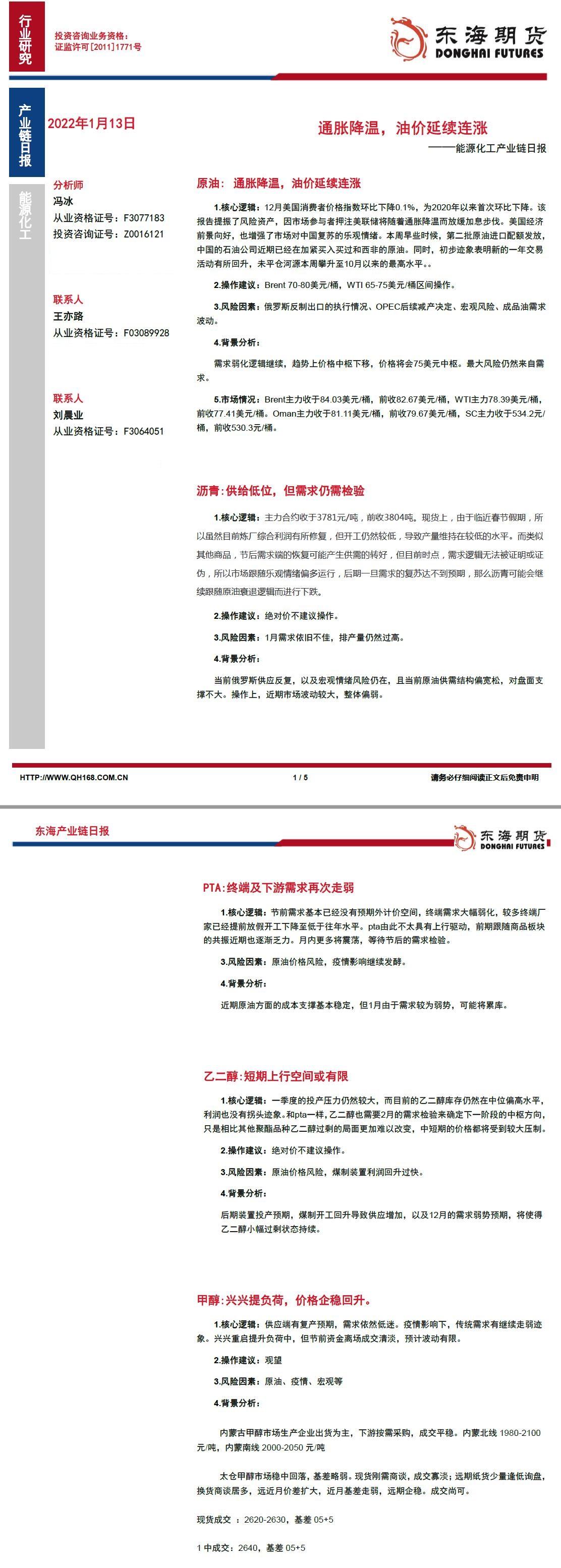 标题:【东海期货1月13日产业链日报】能化篇:通胀降温,油价延续连涨