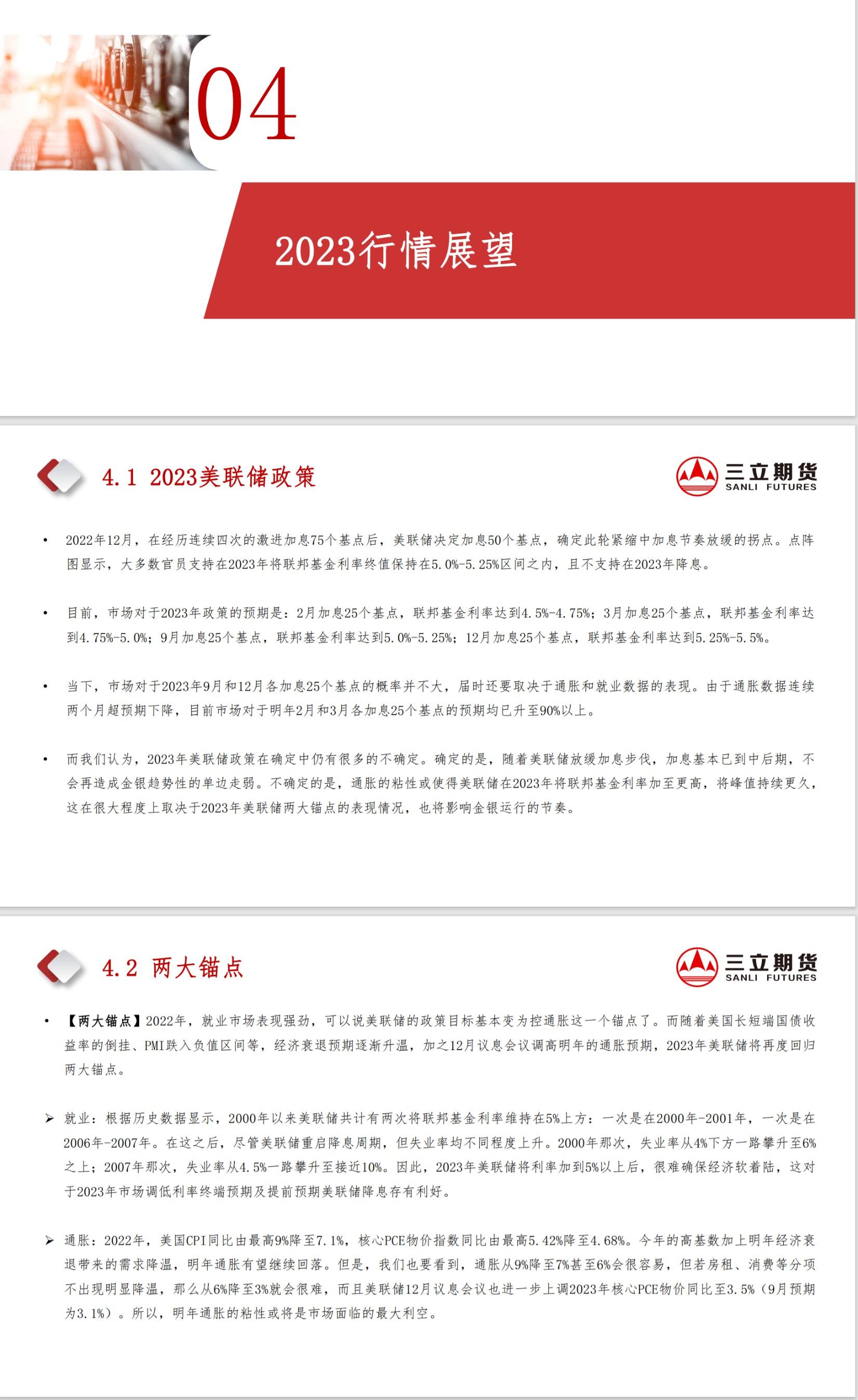 从季度视角来看,第一季度,经济衰退仍将以预期为主,美联储仍将继续加息以确保通胀回归,金银上行空间有限。第二季度和第三季度,以史为鉴,经济衰退将逐渐由预期转为现实,就业数据或将出现恶化,此时金银上行驱动将变得更强,但空间和节奏还是要看通胀能否如期回归。到了第四季度,市场基本在走2024年的降息预期了,金银的上行驱动会进一步增强。