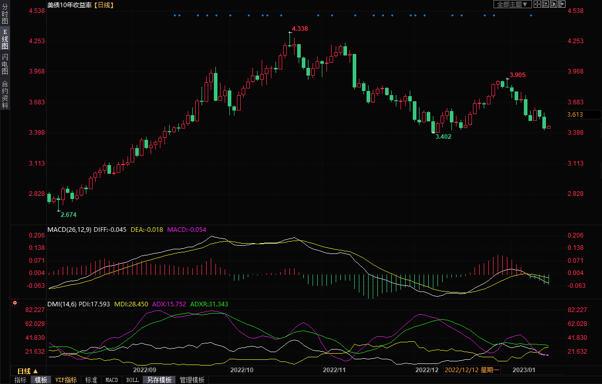 截止周四收盘,美国10年期国债收益率下挫12个基点,报3.447%,盘中最低曾触及3.424%,为12月14日以来新低。美国两年期国债收益率下滑9.2个基点,至4.136%。美国30年期国债收益率下滑12个基点,至3.562%。