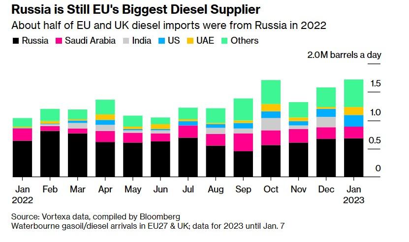 俄罗斯仍是欧盟最大的柴油供应国——2022年,欧盟和英国约一半的柴油进口来自俄罗斯