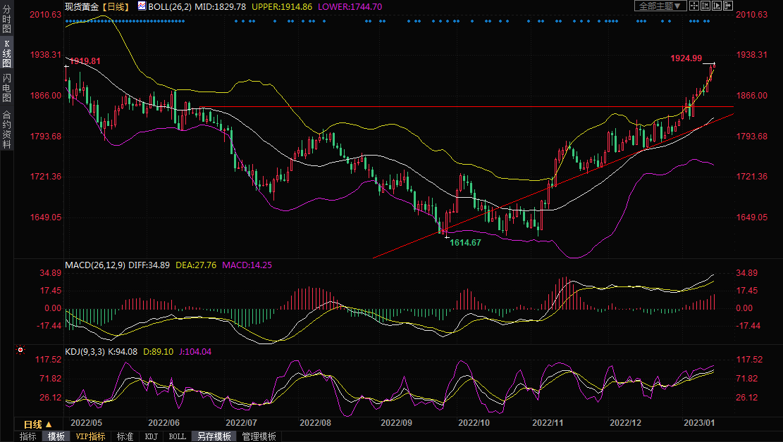 汇通财经APP讯——周一(1月16日)亚市盘初,现货黄金小幅冲高,一度创4月25日以来新高至1924.99美元/盎司,上周美国CPI数据显示通胀增速放缓,美国消费者一年通胀预期也降至近两年最低,强化了市场对美联储放缓加息的预期,这令美元跌创逾七个月新低,帮助金价上周大涨2.87%,周线录得四连阳。