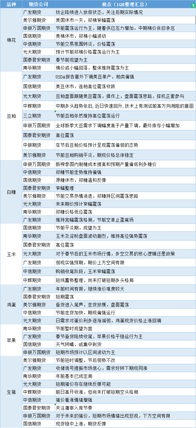 标题:期货公司观点汇总一张图:1月17日农产品(棉花、豆粕、白糖、玉米、鸡蛋、生猪等)