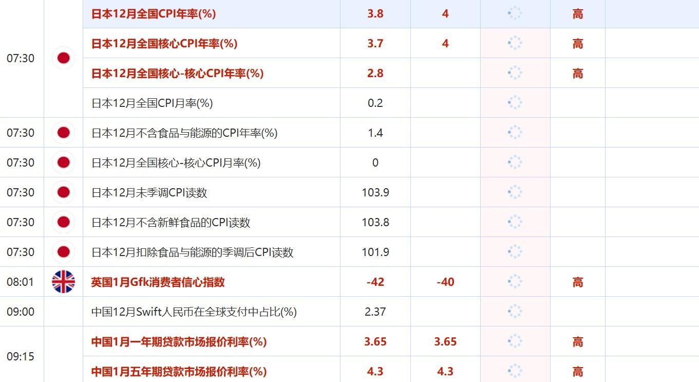 07:30 日本12月全国CPI年率(%) , 前值 3.8 , 预期值 4 , 公布值:待发布