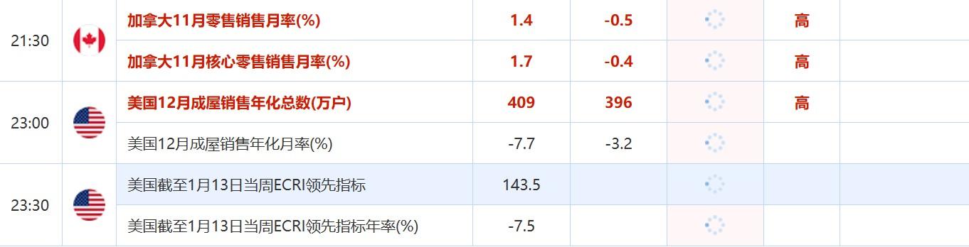 23:00 美国12月成屋销售年化月率(%) , 前值 -7.7 , 预期值 -3.2 , 公布值:待发布