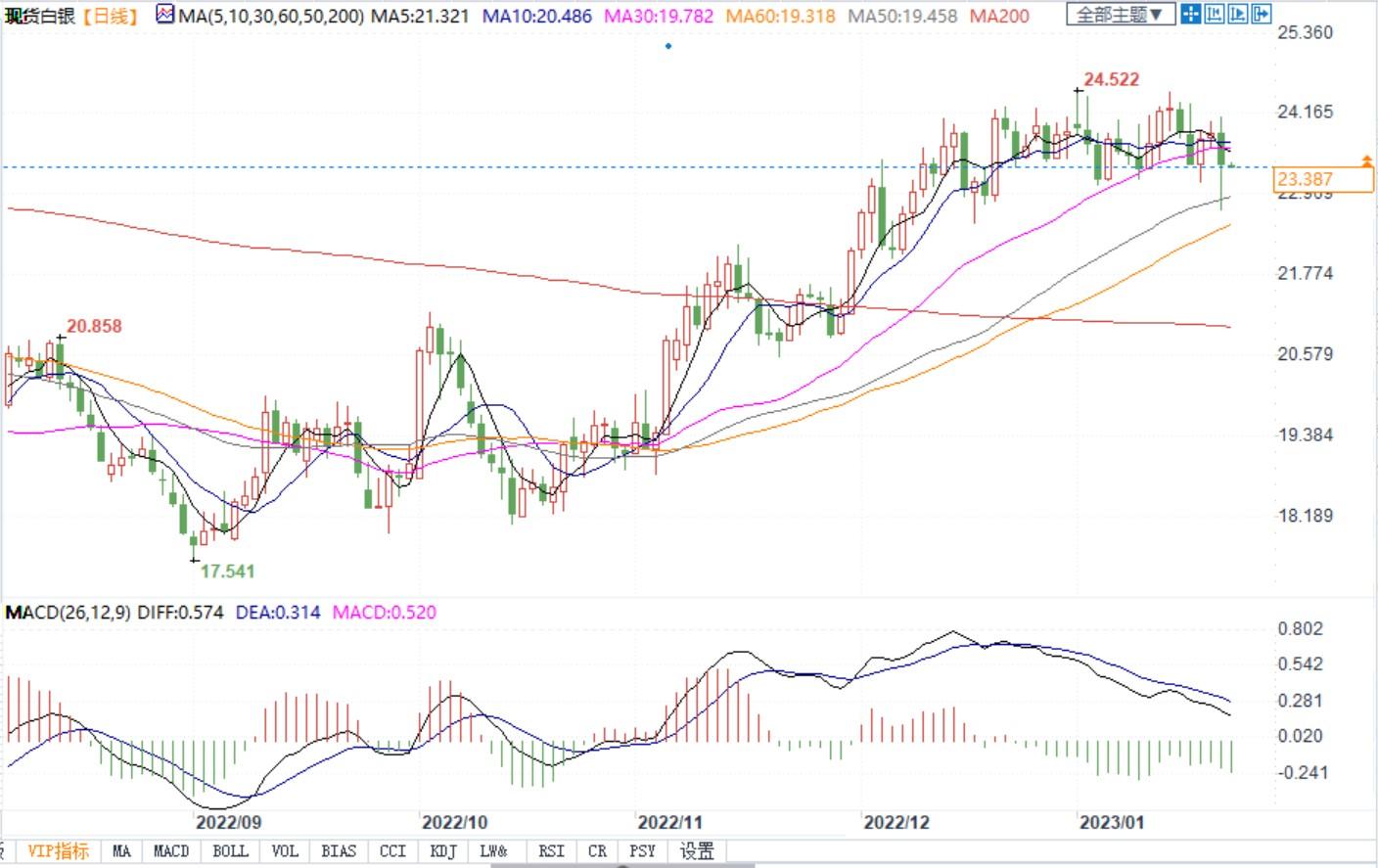 汇通财经APP讯——在2022年11月和12月跑赢黄金之后,白银的涨势已经放缓,价格跌破每盎司24美元。1月23日(周一),现货白银收跌1.97%,报23.43美元/盎司。1月24日亚市早盘,现货白银交投于23.38美元附近。