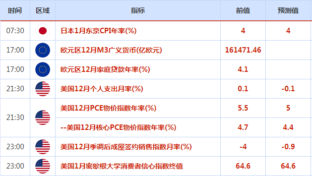 因为周五将迎来美国12月份PCE数据,这是美联储重点监控的数据之一,投资者需要重点关注。目前市场预计猛12月PCE物价同比仅上涨5%,前值为5.5%,如果符合预期,将是近13个月新低,这令美元涨幅受限。