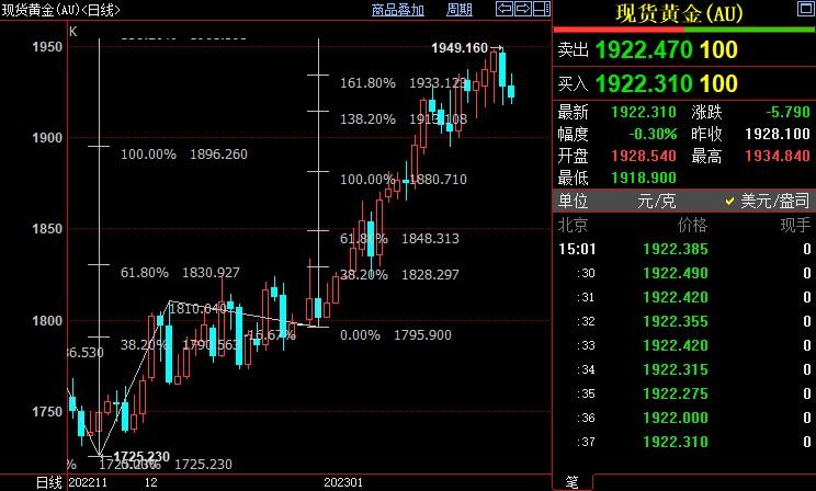 北京时间15:02,现货黄金下跌0.28%至1922.83美元/盎司;COMEX期金主力合约下滑0.37%至1922.7美元/盎司;美元指数上浮0.19%至102.014。