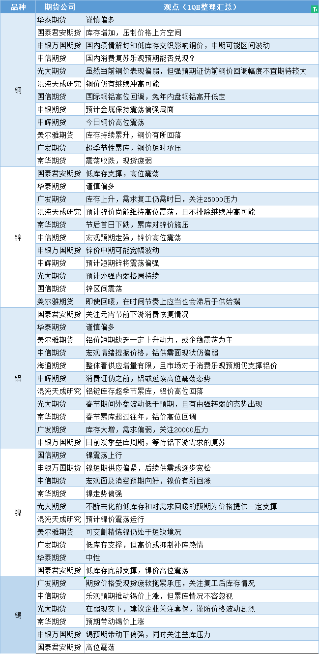 汇通财经APP讯——期货公司观点汇总一张图:1月31日有色系(铜、锌、铝、镍、锡等)