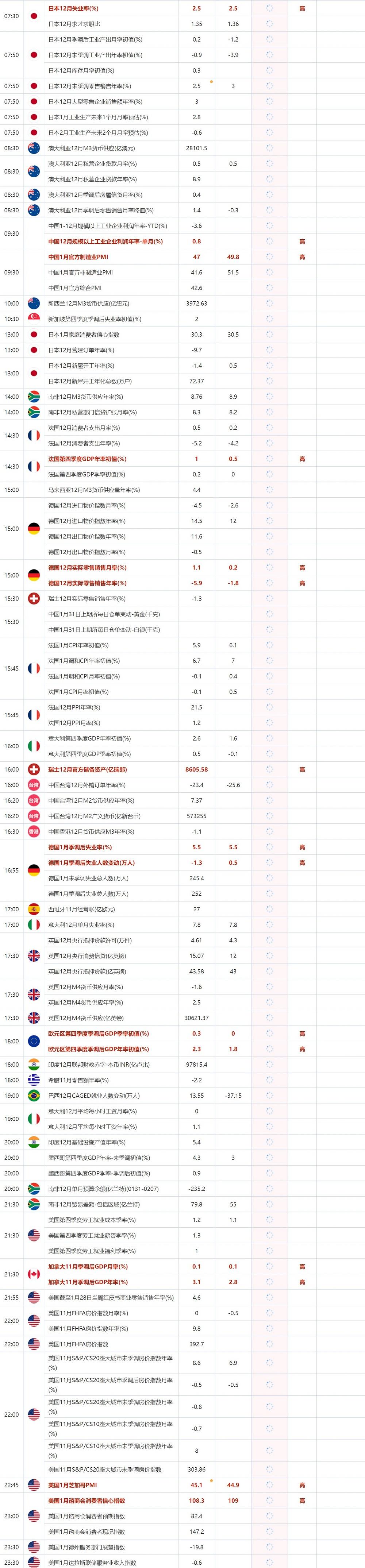 汇通财经APP讯——1月31日,投资者需要关注的重点数据:中国1月官方制造业PMI,德国12月实际零售销售月率,德国1月季调后失业率,欧元区第四季度季调后GDP季率初值,德国1月CPI年率初值,加拿大11月季调后GDP月率,美国1月芝加哥PMI和美国1月谘商会消费者信心指数。