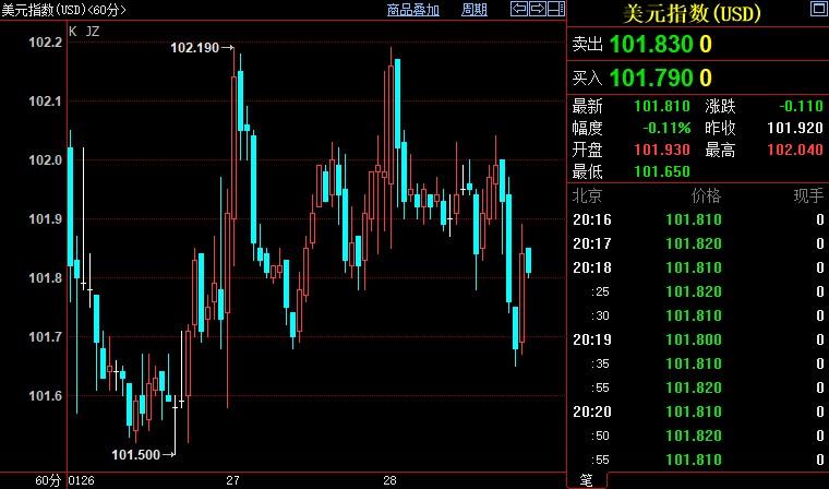 北京时间20:20,现货黄金下跌0.13%至1926.01美元/盎司;COMEX期金主力合约下跌0.17%至1926.2美元/盎司;美元指数下跌0.11%至101.819。