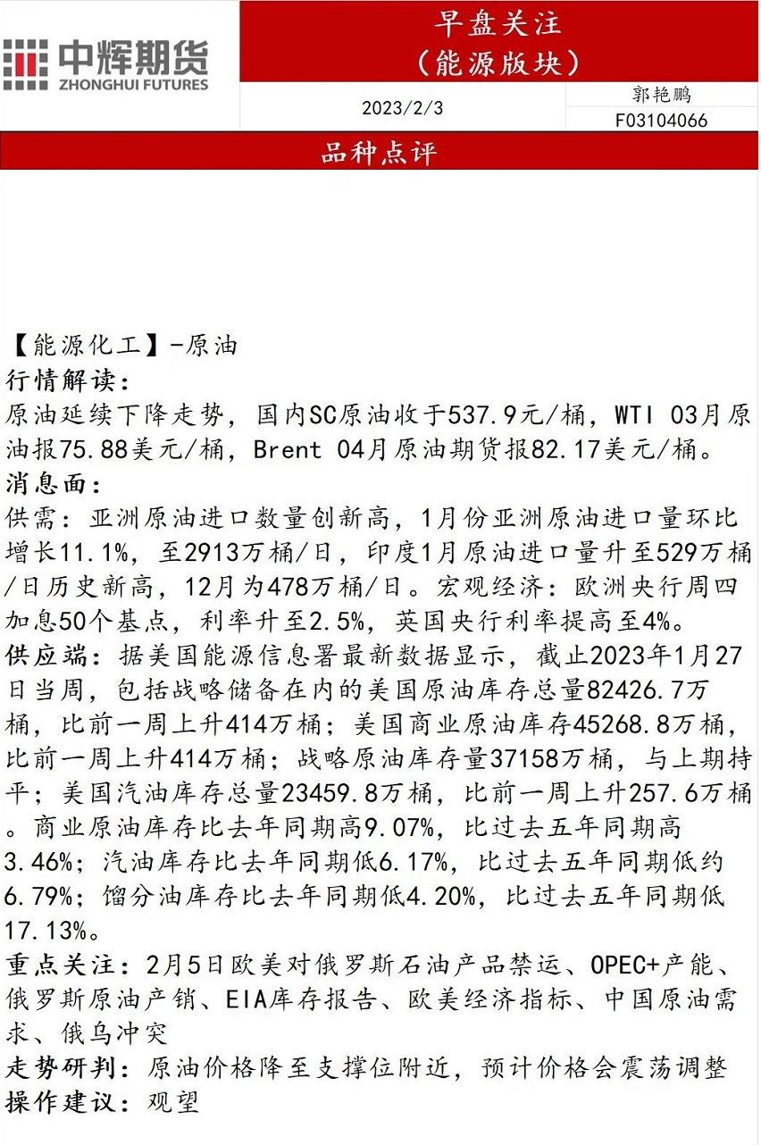 汇通财经APP讯——2月3日,中辉期货发布能源早盘关注,称原油价格降至支撑位附近,预计价格会震荡整理,建议观望。 中辉期货公司授权文本由“专注期货开户交易及专业行情分析资讯网站”:【一期货 www.1qh.cn】转发