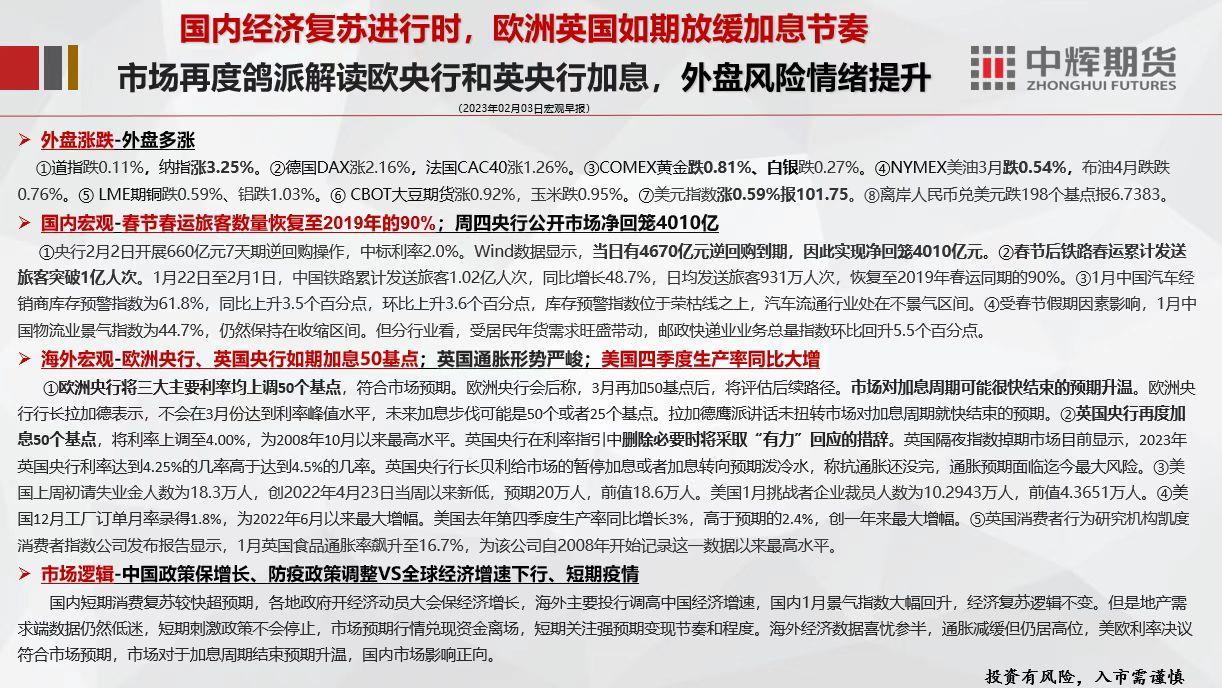 汇通财经APP讯——2月3日,中辉期货发布宏观早报,称美欧利率决议符合市场预期,市场对于加息周期结束预期升温,国内市场影响正向。中辉期货公司授权文本由“专注期货开户交易及专业行情分析资讯网站”:【一期货 www.1qh.cn】转发