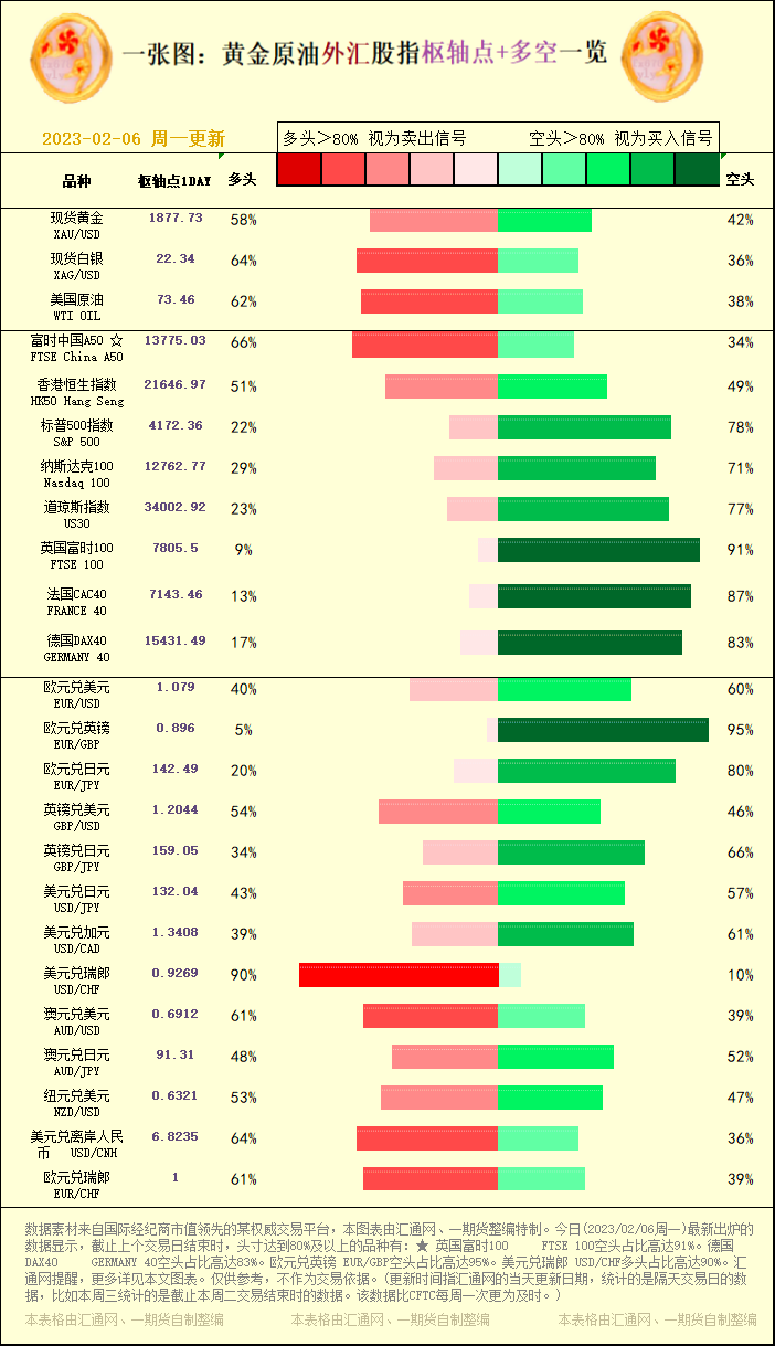 标题:一张图:黄金原油外汇股指"枢纽点+多空占比"一览(2023/02/06周一)