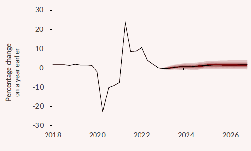 英国央行目前预测,截至2024年第一季度末,英国GDP将下降0.7%。