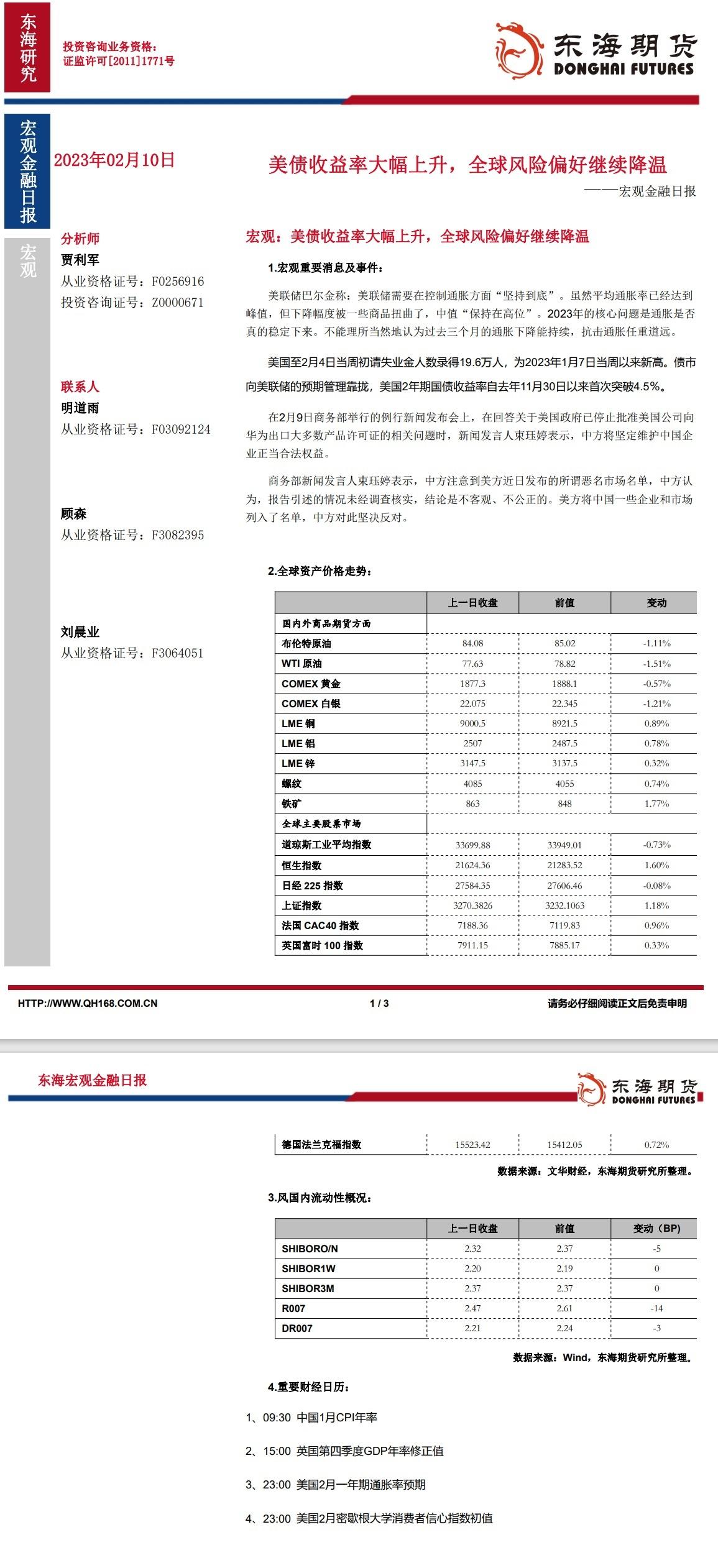标题:【东海期货2月10日宏观金融日报】:美债收益率大幅上升,全球风险偏好继续降温