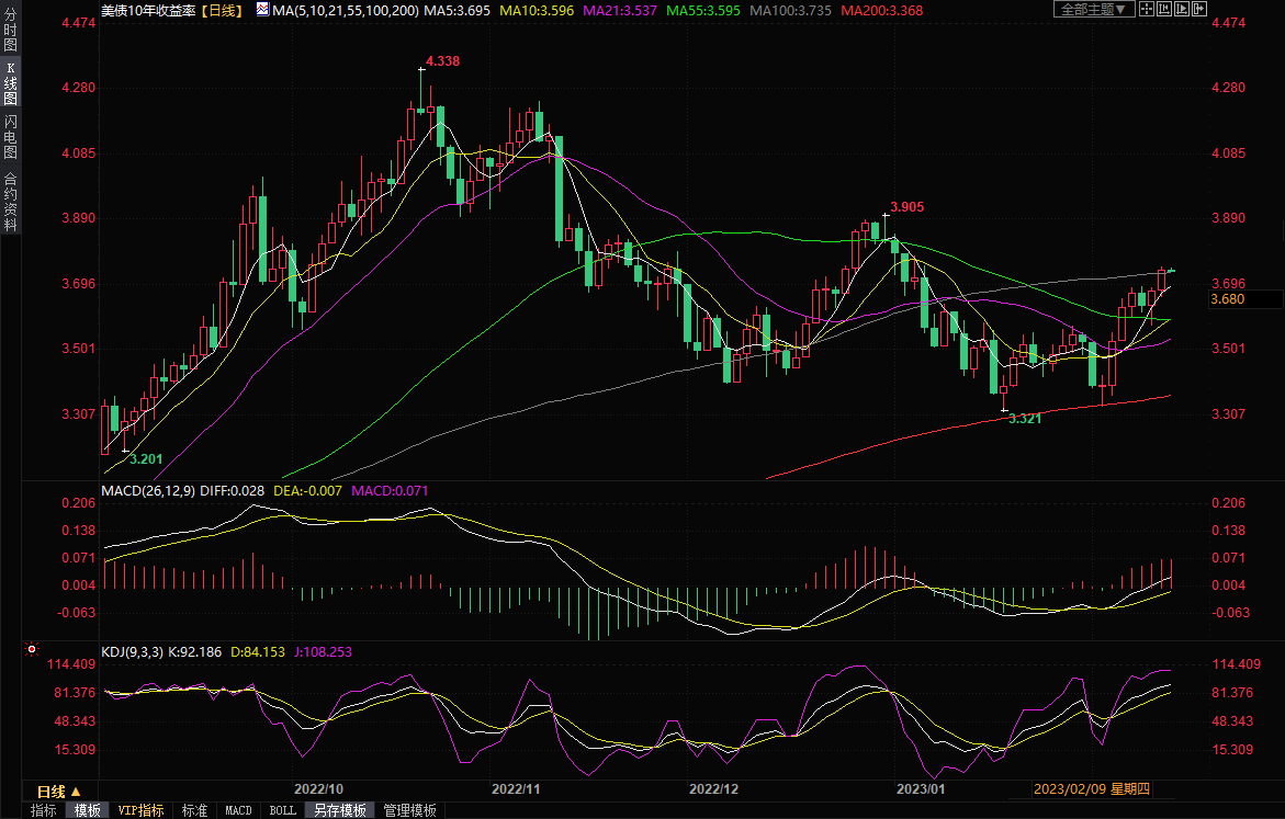 10年期国债收益率上周五盘尾报3.749%,为1月6日以来最高。两年期美债收益率上周五触及4.525%的11月30日以来最高。
