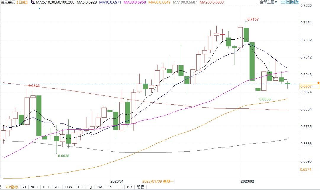 北京时间2月13日10:07,澳元兑美元报0.6909/10
