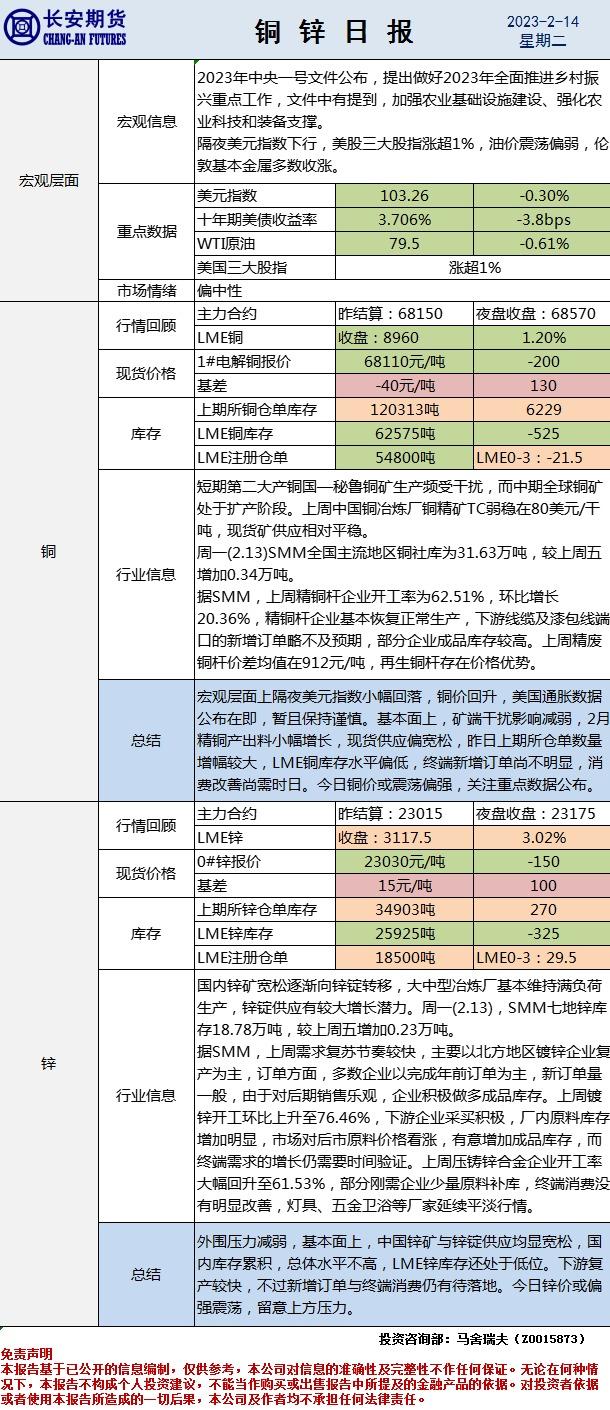 汇通财经APP讯——2月14日,长安期货发布铜锌早评,称今日铜价或震荡偏强,关注重点数据公布;今日锌价或偏强震荡,留意上方压力。 长安期货公司授权文本由“专注期货开户交易及专业行情分析资讯网站”:【一期货 www.1qh.cn】转发