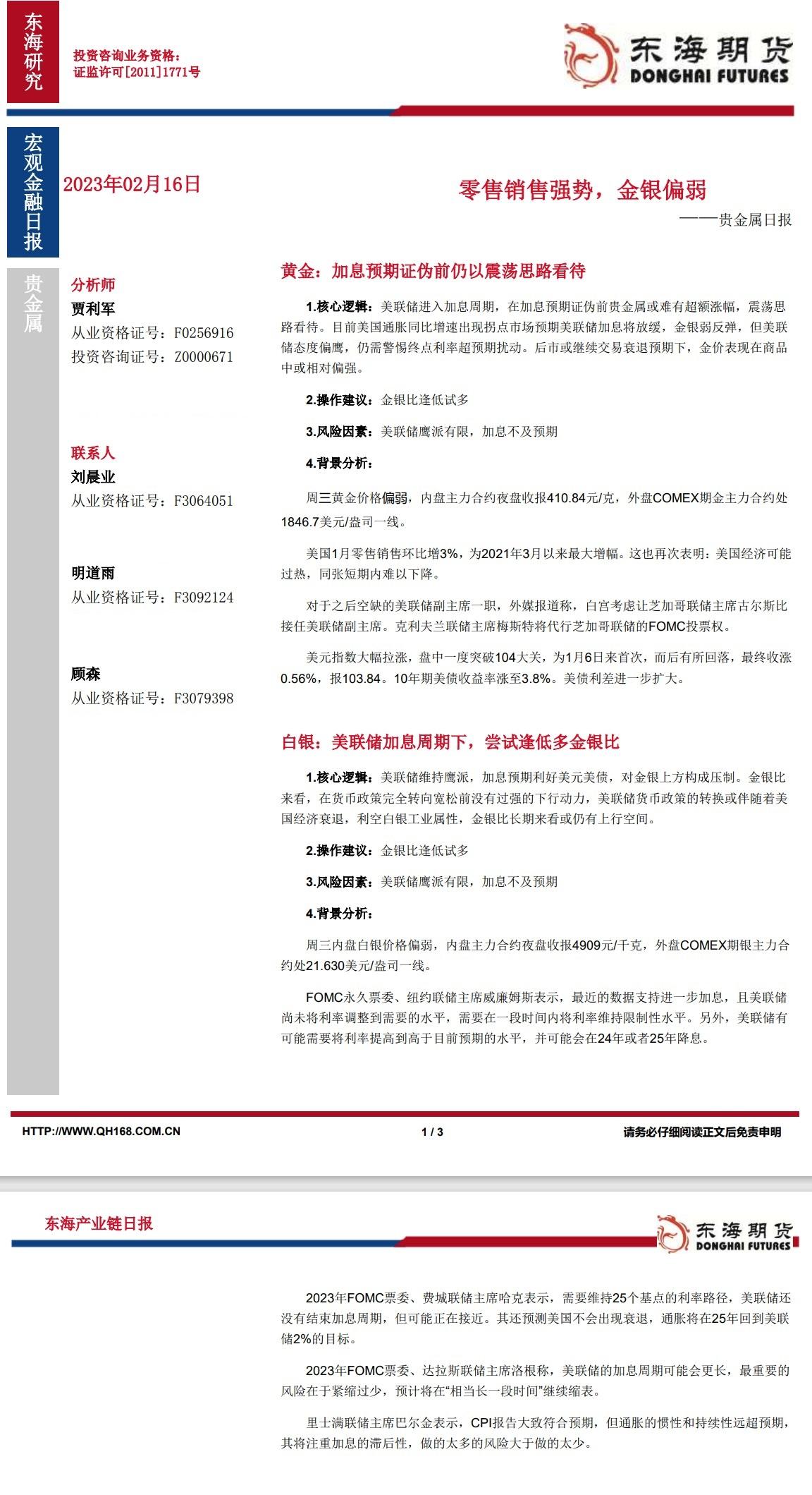 标题:【东海期货2月16日产业链日报】贵金属篇:零售销售强势,金银偏弱