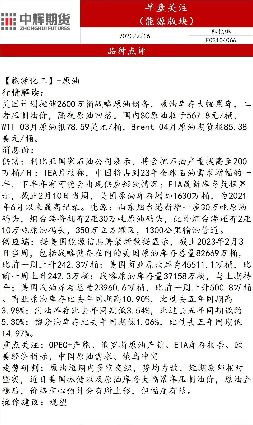 汇通财经APP讯——2月16日,中辉期货发布能源早盘关注,称原油价格重心预计会有所上移,但幅度有限,建议观望。中辉期货公司授权文本由“专注期货开户交易及专业行情分析资讯网站”:【一期货 www.1qh.cn】转发
