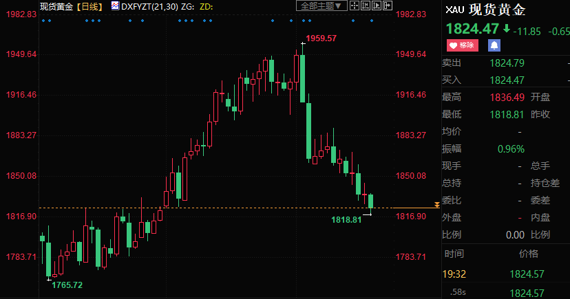截止发稿,现货黄金下跌2.18%至1824.49美元/盎司;COMEX期金主力合约下跌2.29%至1833.5美元/盎司;美元指数上涨0.93%至104.533。