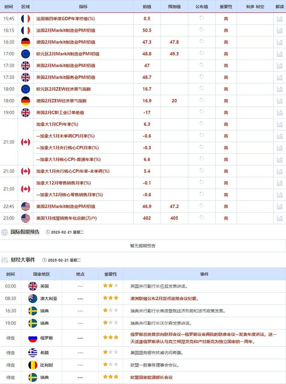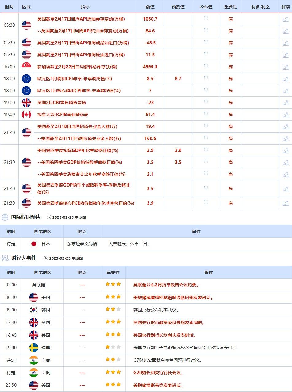2月23日当天,投资者还需关注的大事:美联储威廉姆斯就遏制通胀问题发表讲话;英国央行货币政策委员曼恩发表演讲;英国央行副行长坎利夫发表讲话;G20财长和央行行长会议;美联储博斯蒂克发表讲话。