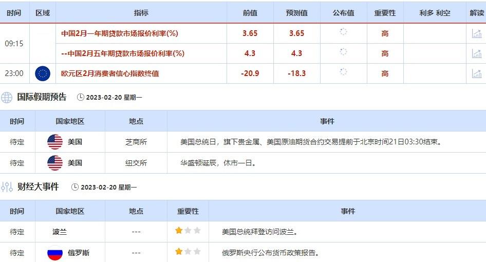2月20日,美国纽交所因华盛顿诞辰,休市一日;芝商所因美国总统日,旗下贵金属、美国原油期货合约交易提前于北京时间21日03:30结束。