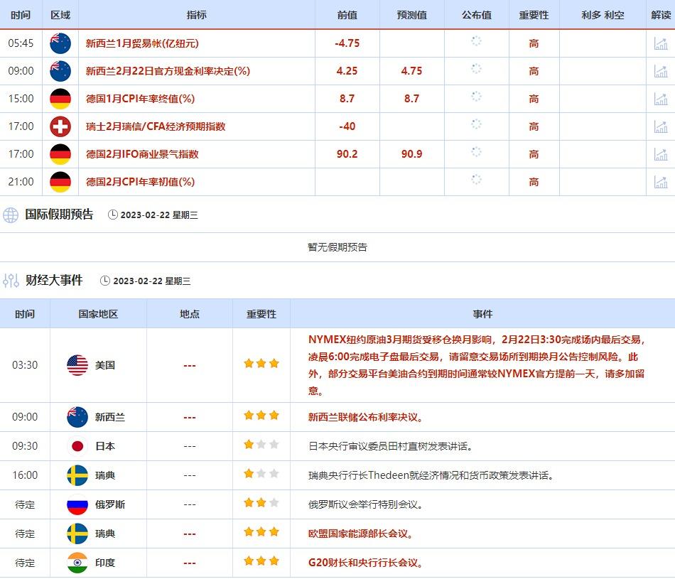2月22日,投资者首先需关注新西兰联储利率决议。新西兰银行称,预计新西兰联储2月将加息50个基点,预计利率峰值为5%。