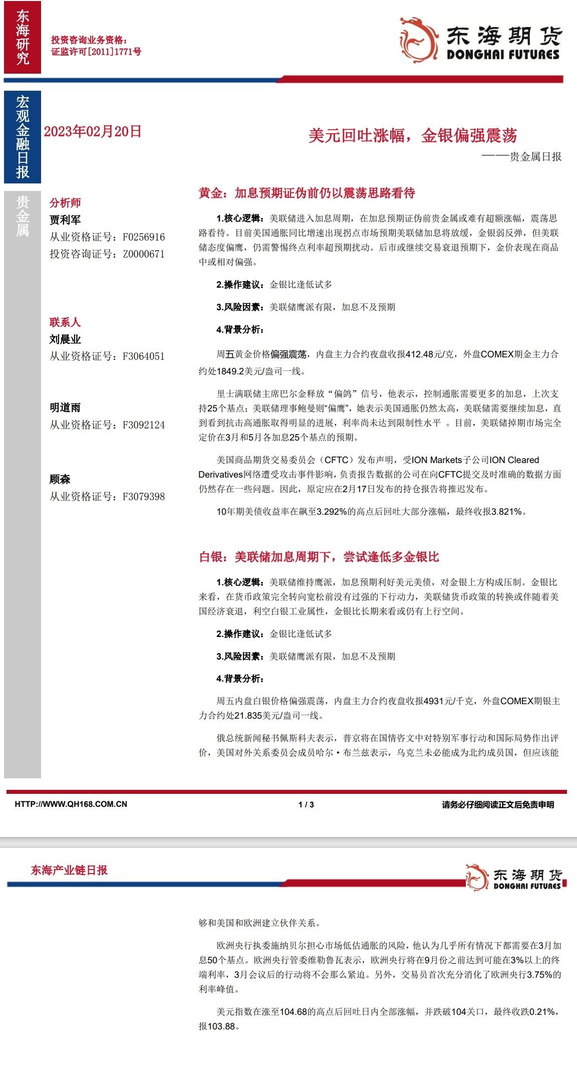 标题:【东海期货2月20日产业链日报】贵金属篇:美元回吐涨幅,金银偏强震荡