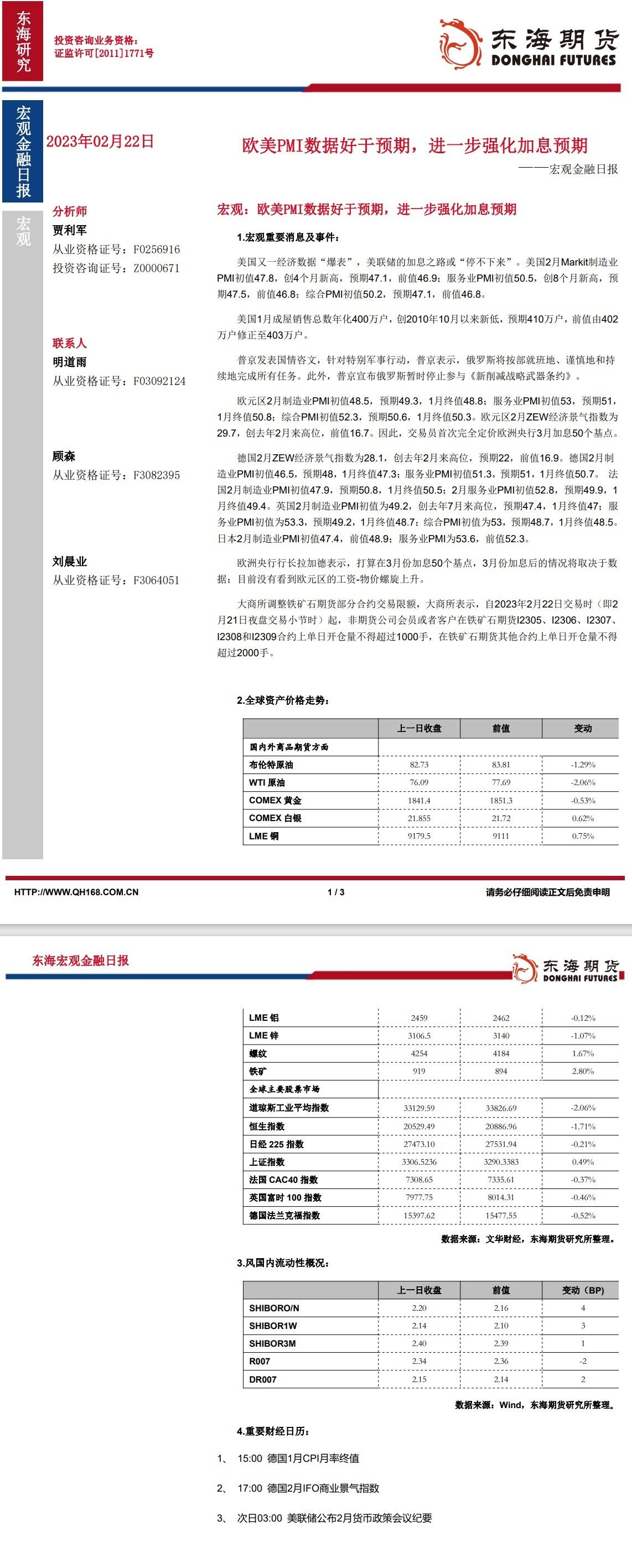 标题:【东海期货2月22日宏观金融日报】:欧美PMI数据好于预期,进一步强化加息预期
