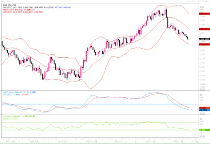 技术图形上,黄金冲击上方1845压力位不过后,一直处于下跌之中,在1817多轮试踩后,上周五终于颇为,最低抵达至1808一线,心里整数支撑关口1800显得岌岌可危。如果本周来自美国得经济数据(如1月耐用品订单、成屋销售、2月MARKIT制造业PMI终值等)继续显示强劲,则黄金得下行压力就难以得到缓解。1800关口下坡后,下方将分别考验1788和1763等水平得支撑力度。上方得初步阻力在1827,而要扭转跌势专升得关键要看能否突破1845-1850水平。