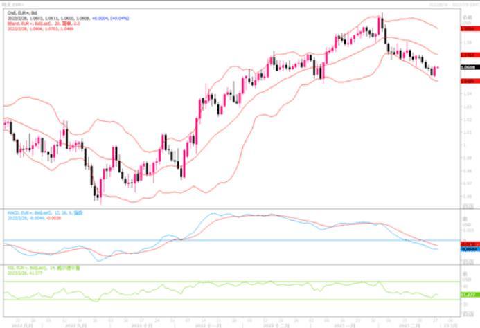 周一(2月27日)美元周一从七周高位回落,欧元兑美元上涨0.58%,至1.0607美。1月美国耐久财订单下降4.5%,降幅大于预期,耐久财订单在12月增长5.1%。这份报告削弱了美国利率的一些鹰派倾向,因此引起了美元的获利回吐行情。市场在等待将于3月10日公布的美国2月失业率和3月14日的消费者物价指数(CPI)数据,这将影响美联储的利率政策和联储推动通胀回归目标的努力。预料在市场看到下一份非农就业报告以及CPI之前,是不会太愿意将美元大幅推低。周一当天欧元区公布2月经济景气指数位99.7低于预期的101;2月消费者信心指数终值为-19符合预期。数据对欧元的影响作用不大,当前走势依然是看美元的脸色。日线图上欧元兑美元似乎在1.05之上的水平暂时得到喘息,但整体上还是处于布林带通道下轨之中,上方1.0665构成初步阻力,进而是1.0740。下方若1.05失守,恐有滑向1.04的风险。