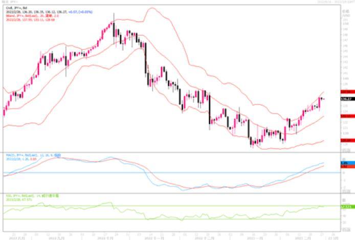 周一(2月27日)美元兑日元虽略有下跌,但仍稳步于近期的高点136.00水平之上。即将上任的日本央行总裁植田和男周一表示,央行当前货币政策的好处超过了成本,强调需要以超低利率继续对经济提供支持。那么,接下来如果市场继续消化美国经济增长的弹性和比预期更多的加息,那么息差因素将会继续影响着美元兑日元的走势。日线图上,美元兑日元继续保持在布林带通道上轨攀升,但短线4小时图上出现超买,或存在短线回落调整的机会,但回落幅度料不大。目前上方137-138构成初步较强的阻力,下方133-135区域则构成支撑。