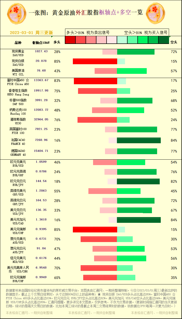 标题:一张图:黄金原油外汇股指"枢纽点+多空占比"一览(2023/03/01周三)