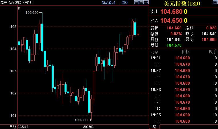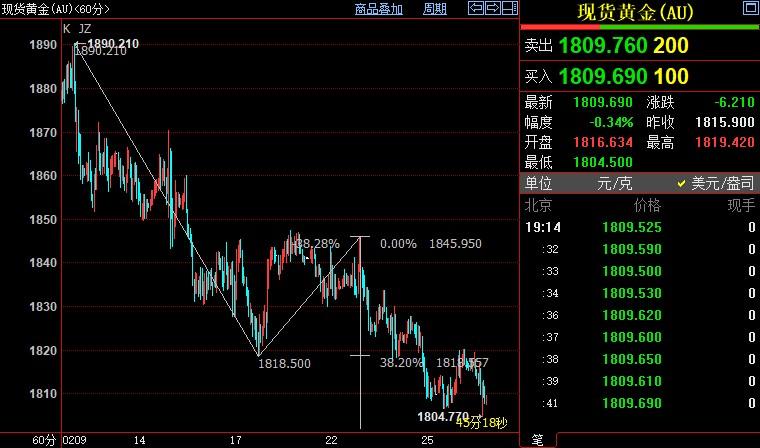 北京时间19:55,现货黄金下跌0.40%至1809.66美元/盎司;COMEX期金主力合约下跌0.45%至1816.6美元/盎司;美元指数上浮0.02%至104.668。