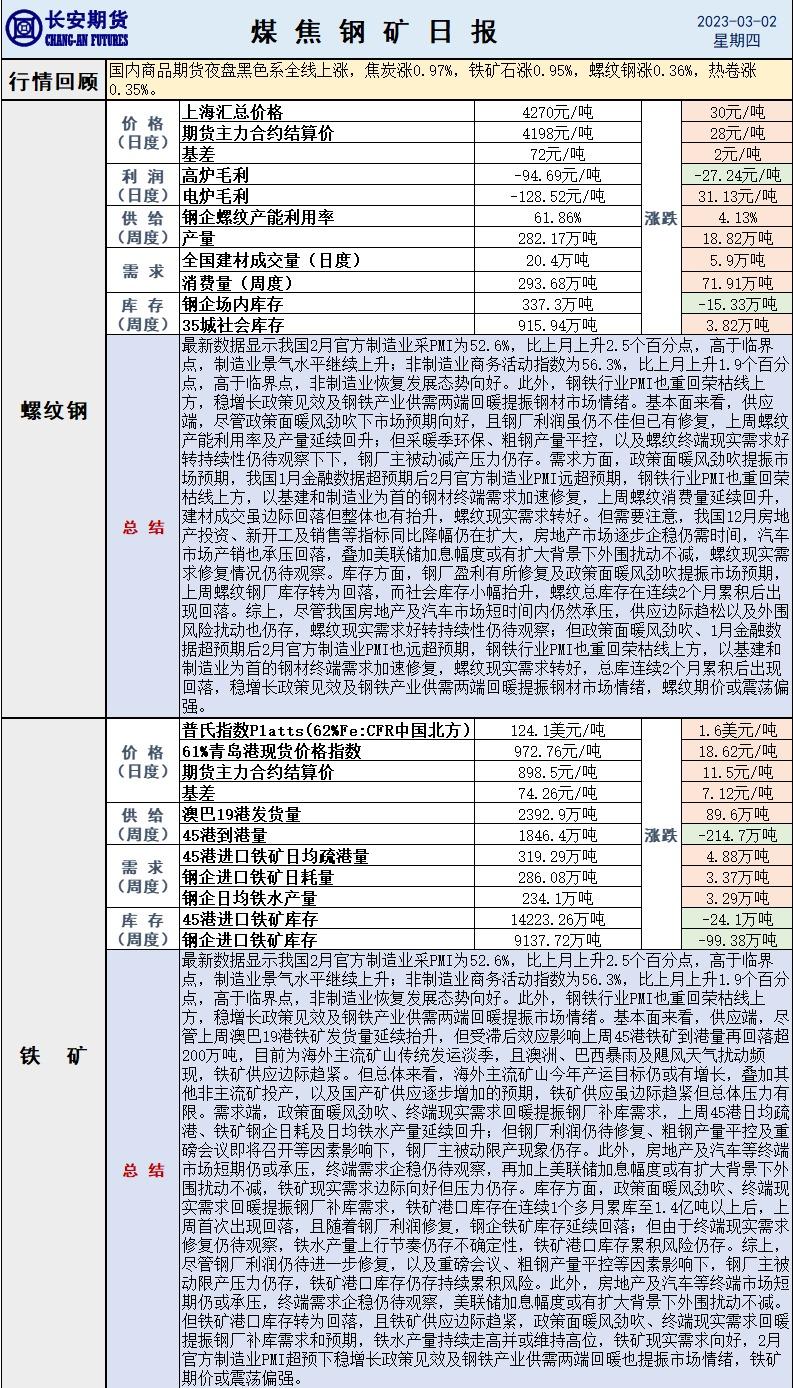 汇通财经APP讯——3月2日,长安期货发布煤焦钢矿早评,称螺纹和铁矿期价或震荡偏强;煤焦有回落风险,动力煤维持震荡偏弱运行。 长安期货公司授权文本由“专注期货开户交易及专业行情分析资讯网站”:【一期货 www.1qh.cn】转发