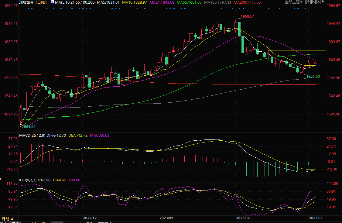 整体来看,虽然美国就业数据相对强劲,美元仍相对强势,美债收益率持续飙升,令黄金多头有所顾忌,欧洲央行的进一步加息预期,也略微压制金价,但美联储大鹰派博斯蒂克的讲话暗示美联储官员不会再进一步扩大加息步伐,如果其他官员也发表类似观点,金价或将进一步获得中长线逢低买盘的支撑,预计金价短线仍有望向上试探1860关口附近阻力。北京时间10:14,