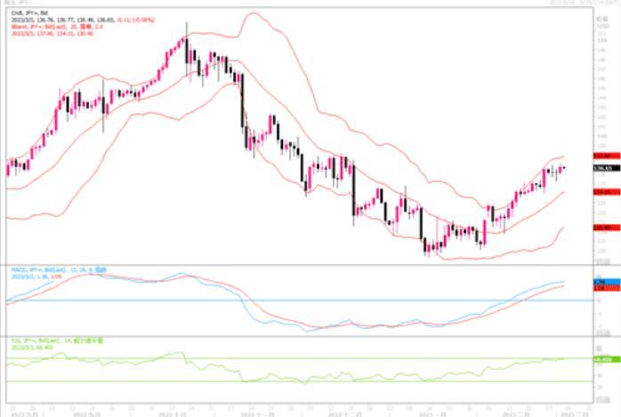 周四(3月1日)美元兑日元上涨0.42%,收盘于136.77,盘中一度穿破137。周四当天美国劳工部表示,在截至2月25日的一周内,初次失业金人数减少2,000人,经季节性调整后为19万人。这是初请失业金人数连续第七周保持在20万人以下。劳工部的第二份报告显示,单位劳工成本--即每单位产出所需的劳动力价格--在第四季环比年率攀升3.2%。2月报告的前值为上涨1.1%。劳动力成本在第三季攀升6.9%,此前两个季度也均大幅上涨。数据表明,美国的核心通胀问题比以前想象的要严重,对利率预期敏感的两年期美债收益率盘中触及2007年7月以来最高。利率期货稍早的定价显示,市场预计到9月联邦基金利率将攀升至5.493%的峰值。这也预示着市场认为美联储将进一步加息以抑制不断上涨的消费价格。反观日本方面,日央行仍不愿改变其鸽派立场,日本债券收益率仍然低迷。两国央行的举措,使得美元的前景看起来在短期内比日元更具建设性。如果22年10月-2023年1月修正的38.2%斐波那契回档位137.20破位,则美元多头极有可能将美元兑日元推向138-140这些心里区域。而目前日元若要回强,除非日本央行在货币政策上有动作。