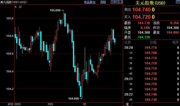 北京时间20:21,现货黄金下行0.07%至1835.10美元/盎司;COMEX期金主力合约下跌0.22%至1841.3美元/盎司;美元指数上涨0.33%至104.736。