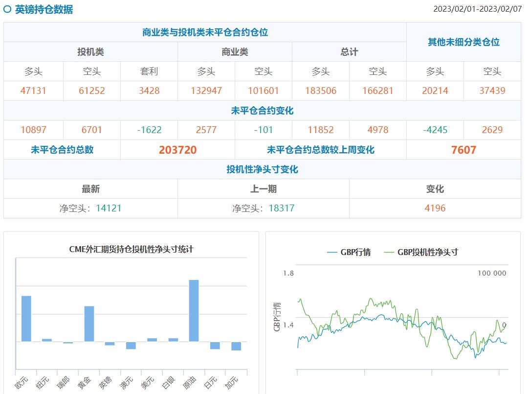 货币方面:截至2月7日当周,英镑净空头头寸增加4196手,至14121手。美元投机者将净多头头寸减少4268手,至12269手。