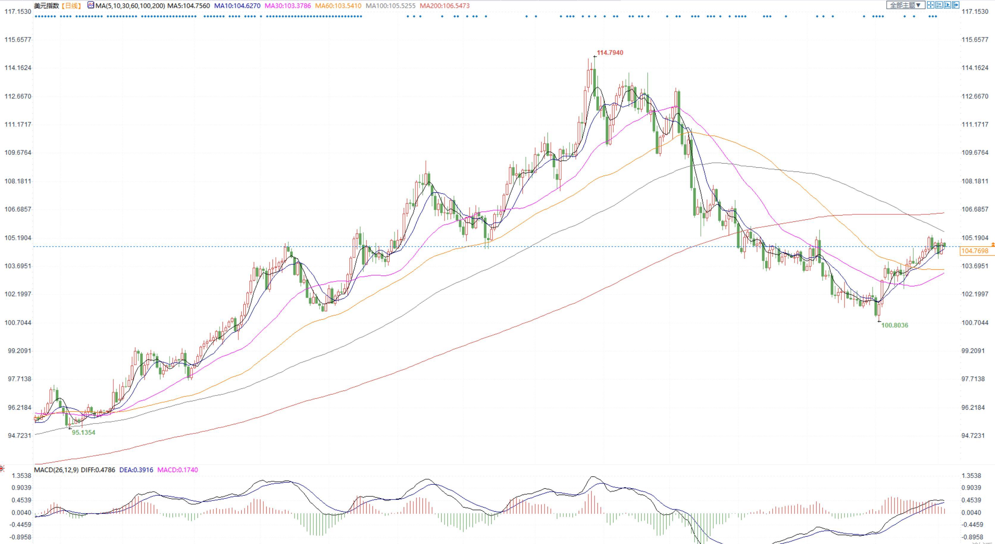 美元指数本周震荡回落,中国经济复苏,美国经济衰退升温施压美元,而美联储鹰派基调始终支持美元