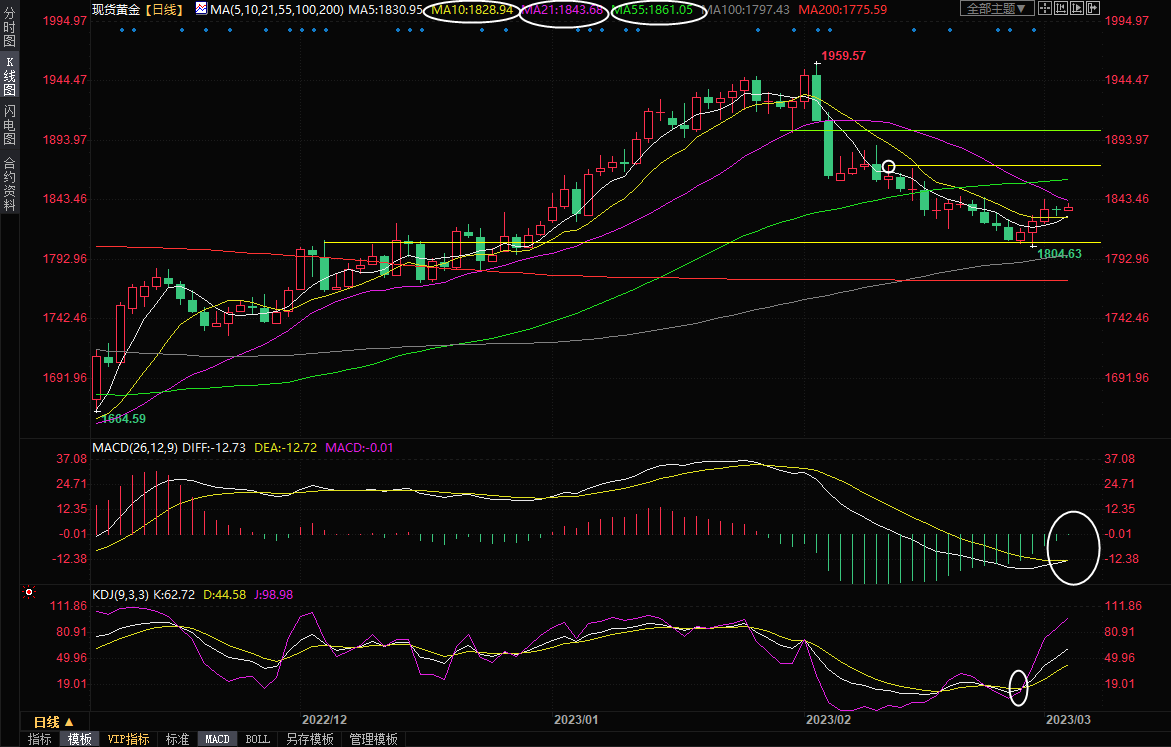 下方10日均线支撑目前在1828.93附近,然后是周三低点1822.93附近支撑,也可以参考1820关口,若回落至该位置下方,则增加短线看空信号。