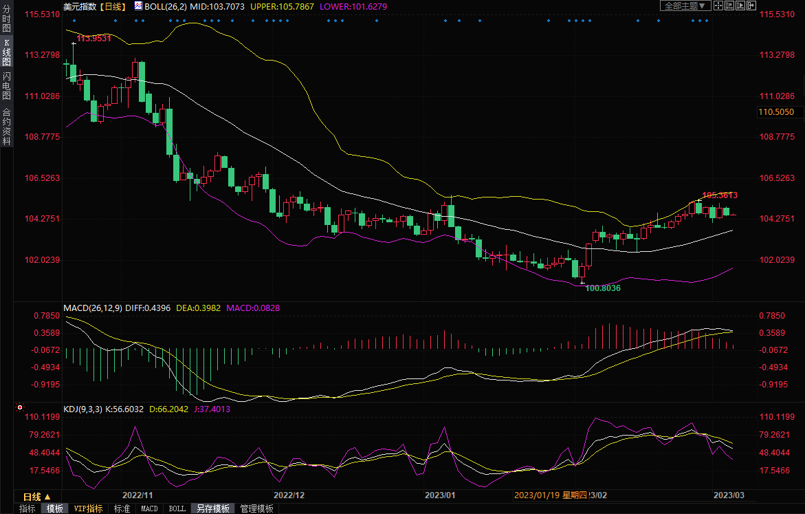 美元指数上周一度冲高至105.36,为1月6日以来最,上周五收跌0.43%,收报104.53,周线跌幅约0.7%,创下1月15日当周以来的最大百分比跌幅,结束了连续四周的上涨走势。